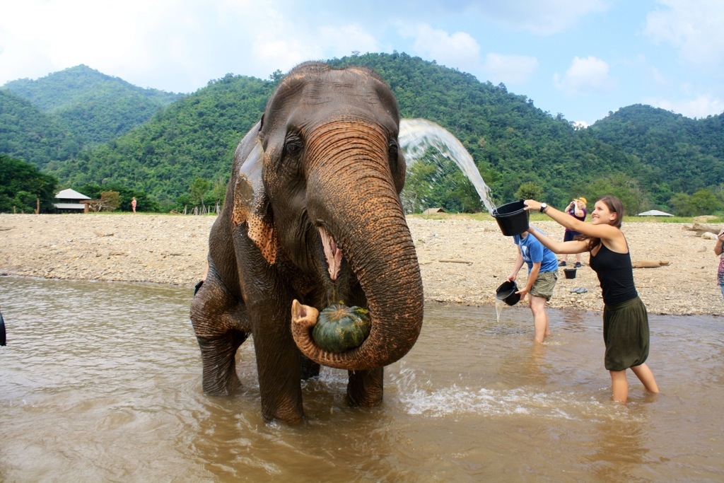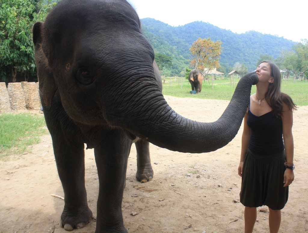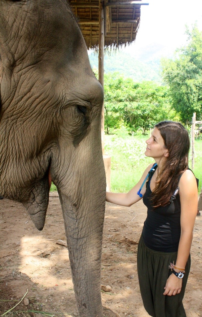 The stories of these elephants’ traumatic pasts were evident in the scars they bore. While falling in love with these 32 endearing creatures, we were educated on the travesties they endured. Broken legs, broken hips, broken toes that won’t heal from years of logging and tourist rides. Gouged out eyes that have gone blind because of one elephant’s refusal to obey orders, an enraged mahout with a stick. An ear with a hole the size of an orange made by a mahout wielding a hook-like spear (the elephant now wears a flower, her earring, in the hole). The stories of these animals’ suffering affected me suddenly and severely. It was overwhelming, intravenous. In their presence, I was swept with conflicting emotion. I could feel a maternal instinct to protect and to nuture swelling in me. We spent the day respecting and interacting–but not interfering–with the elephants: feeding them, bathing them, admiring them as they roamed freely. Their simple existence inspired a love in me that will, I’m sure, remain unmatched for years to come.