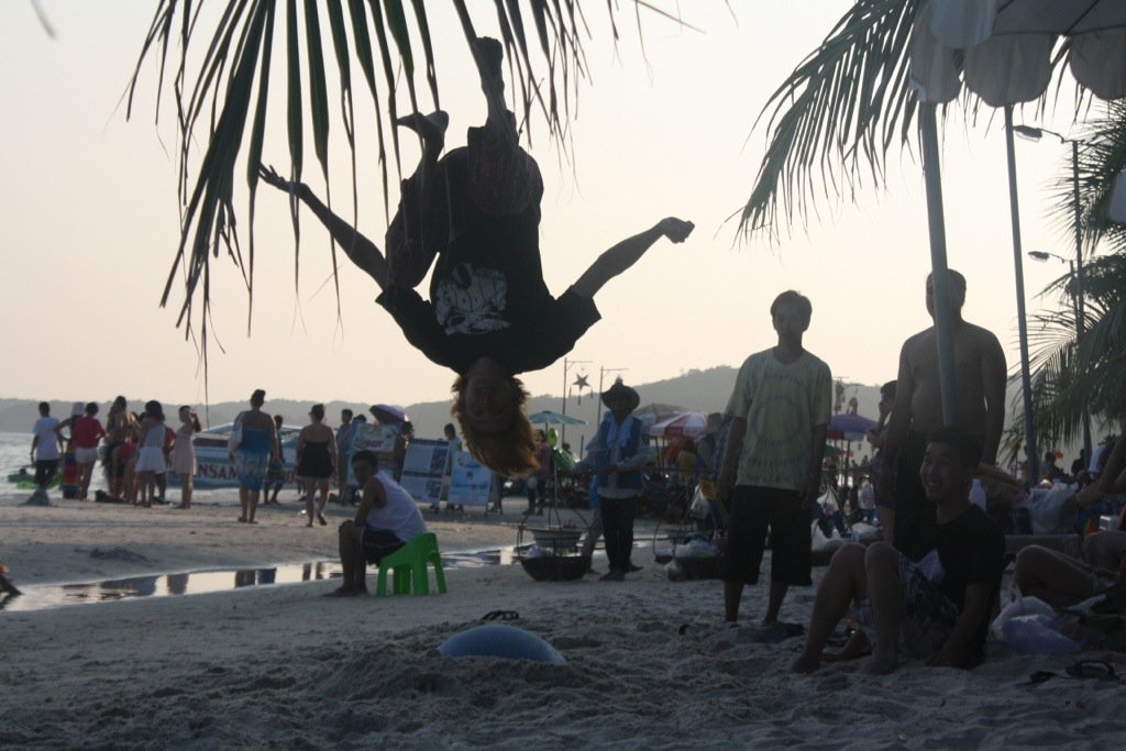 On the beach, tumbling Thai acrobats entertain sun bathers. Thriving on movement. Using a deflated medicine ball wedged into the sand for a spring, they catapult themselves into the air doing back flips, front flips, contorted twists.