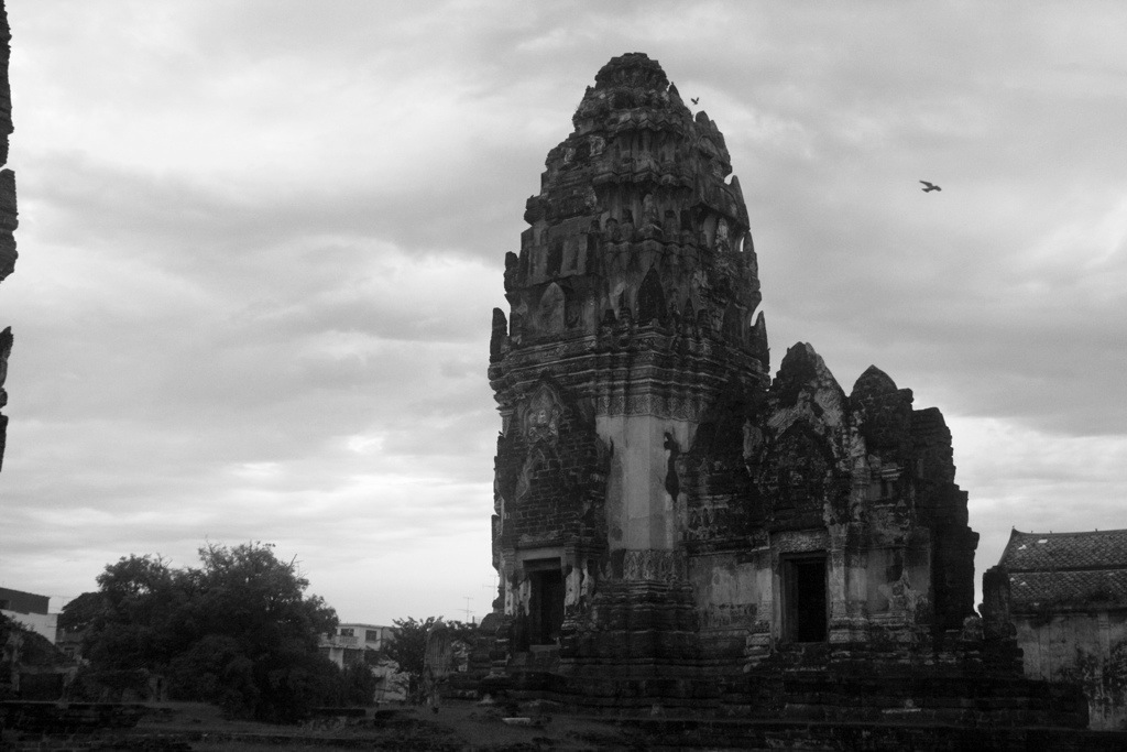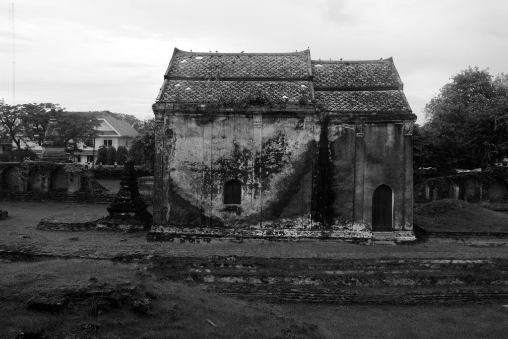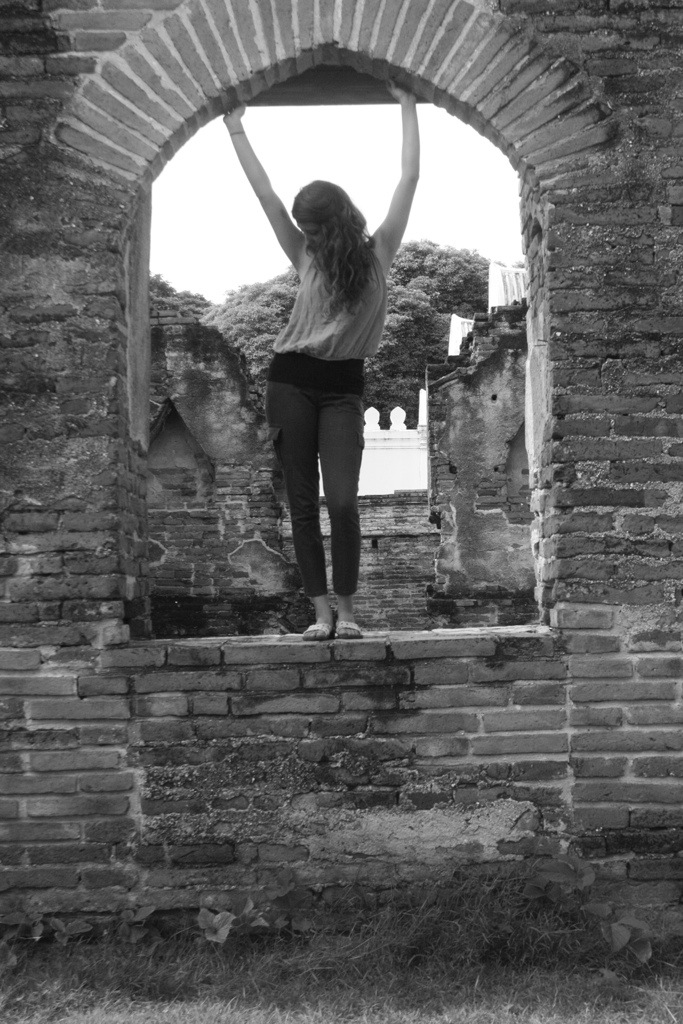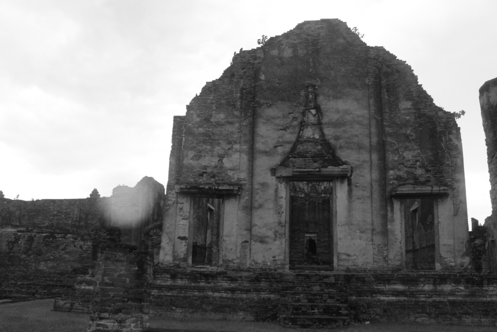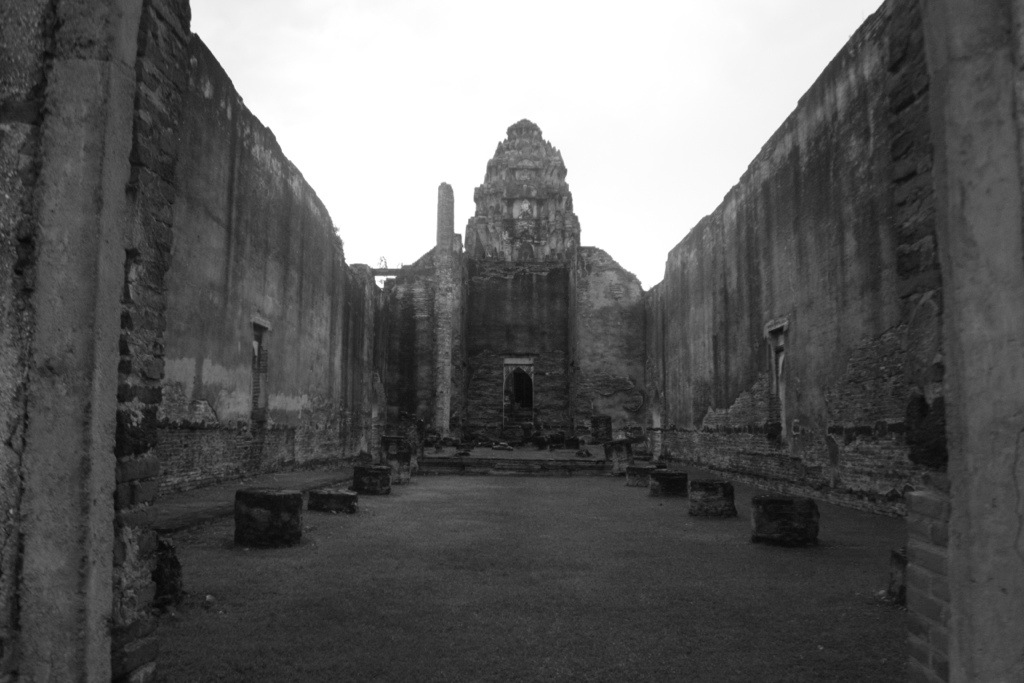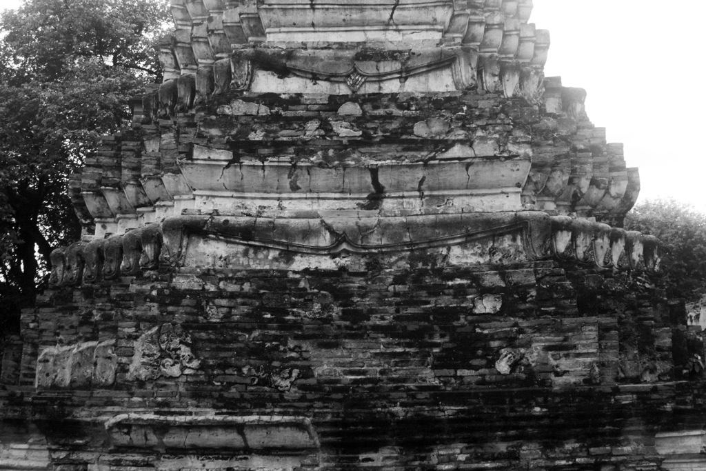 Upon arriving in the old city, I was instantly enraptured by the ancient ruins of Wat Pra Sri Rattana Mahathat–an expansive 14th century site and Buddhist sanctuary from the Ayutthaya period. Within these walls I was silenced, humbled. I felt like I was shrinking amidst the ruins. The architecture was of Khmer influence. Repeating, vertical creases etched in laterite stone creates a hypnosis of layered dimension. As if the image you were seeing straight on started to expand–unfolding at the widths, becoming ten times the original vision. It is this ripple effect, this pleated skirt carved from stone, that holds me. The beauty of each pleat is preserved, reflected and duplicated in the next layer of dimension. Causes the initial emotional effect on the observer, too, to be intensified, multiplied. Sacred symmetry.
