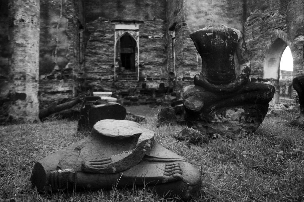 I came here alone, after a storm, when everything was still wet and all the colors vibrant. The rich, deep greens of the moss and the grass in contrast with the earth tones of the weathered stone. Despite this, I opted for monochrome photography. And the colors still came through the photographs. The grounds were strewn with detached limbs and headless buddhas, a most sacrilegious imagery. I felt like an archaeologist on a solitary expedition to discover the mystery of what surrounded me. To unearth buried treasures, notice patterns, awaken history.
