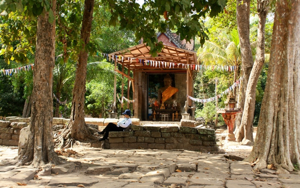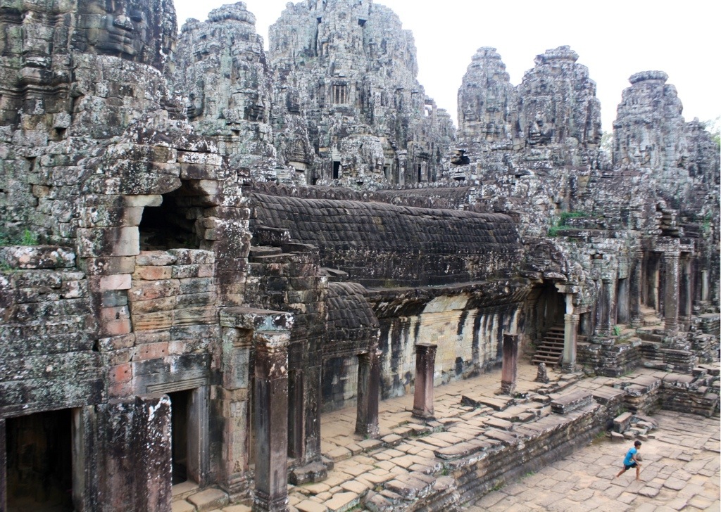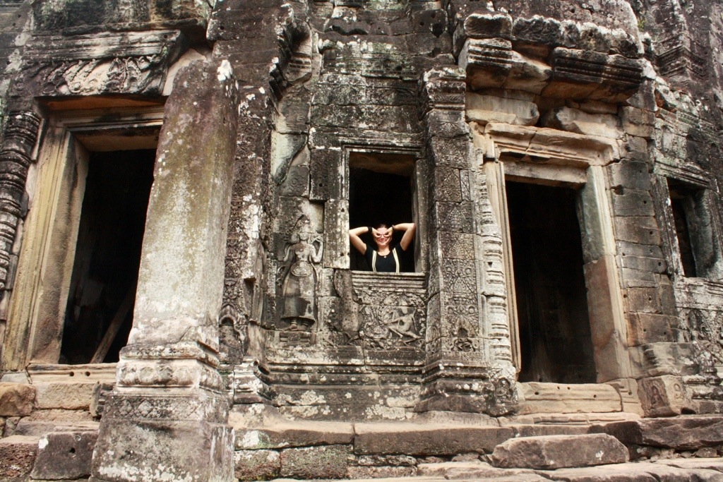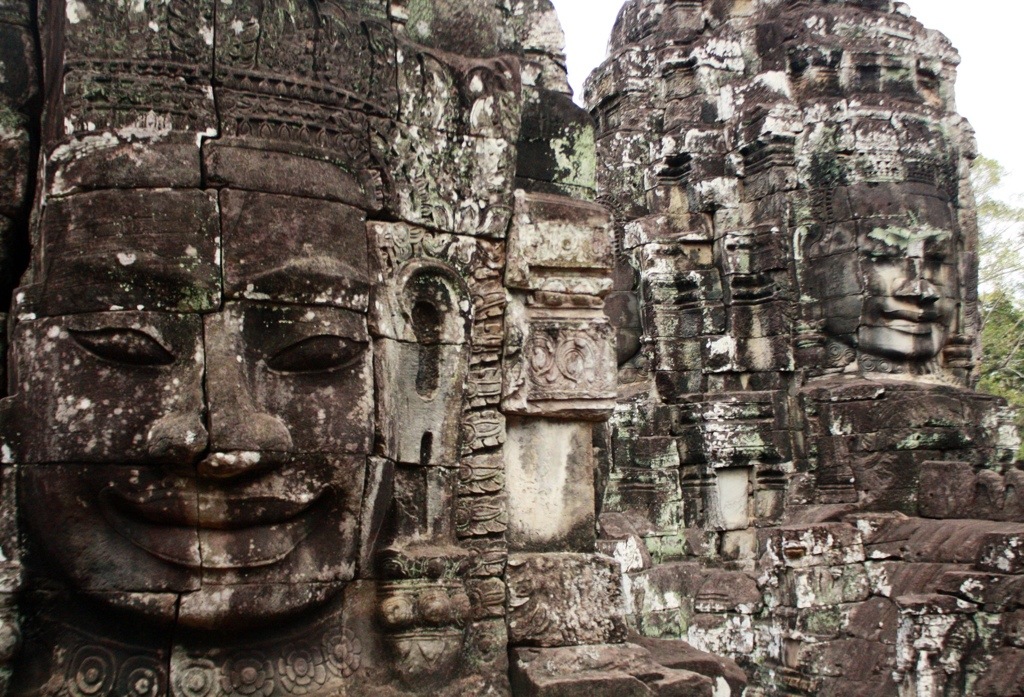 The next day, Mel, Rachel and I rented bikes from our hostel and rode along the Siem Reap River beneath a shade of trees en route to Angkor. Deciding to bypass Angkor Wat to first explore other, lesser known temples, we headed to meet her brother, the Bayon. Angkor Wat is believed to honor the feminine element in nature, while The Bayon is said to symbolize the masculine element (Ba- denotes the masculine, yon- a Khmer translation of the Sanskrit ‘yantra’). The Bayon rests on a rectangular piece of ground which serves as the exact geometrical center of Angkor Thom. As you ascend the steps to meet this protective brother, the compound that guards the entrance to Angkor, you may or may not notice that you are being watched by hundreds of faces. Like a mirage they appear from beneath a stone veil that disguises itself as rubble. Two, three, four faces wrap the facades of towering prang edifices, making pin point impressions. Around every corner another Buddha face unexpectedly emerges, smiling with the ancient wisdom of past civilizations embodied within the time capsule that is their remains. Walking throughout the different levels of the compound, the faces do not reveal themselves to you all at once. They appear individually, subtly, each with their own precise timing and unique magic of optical illusion. In the Bayon, you almost feel tricked. A maze of dizzying perfections.