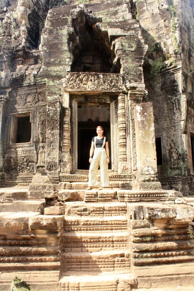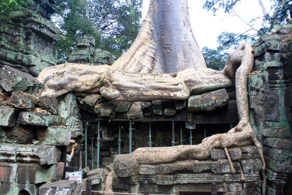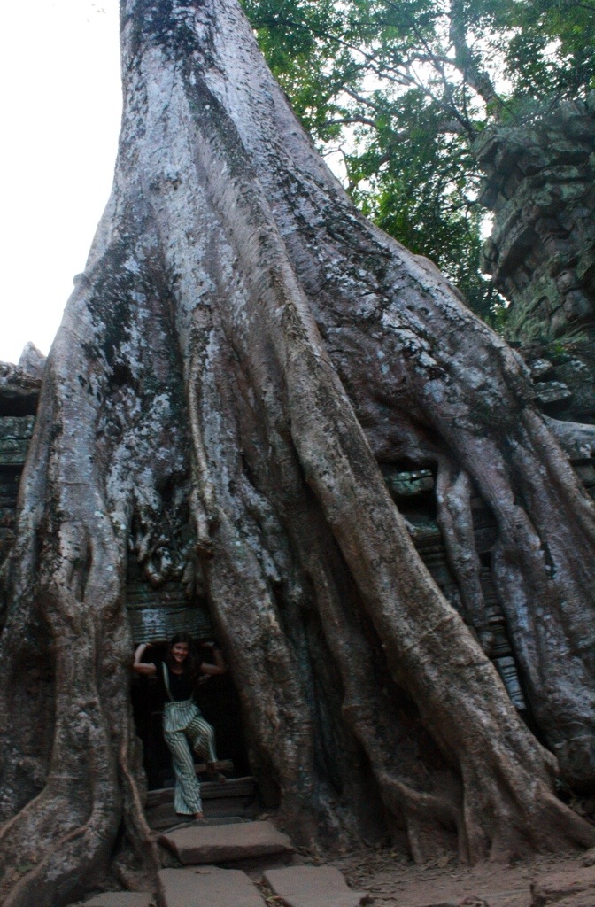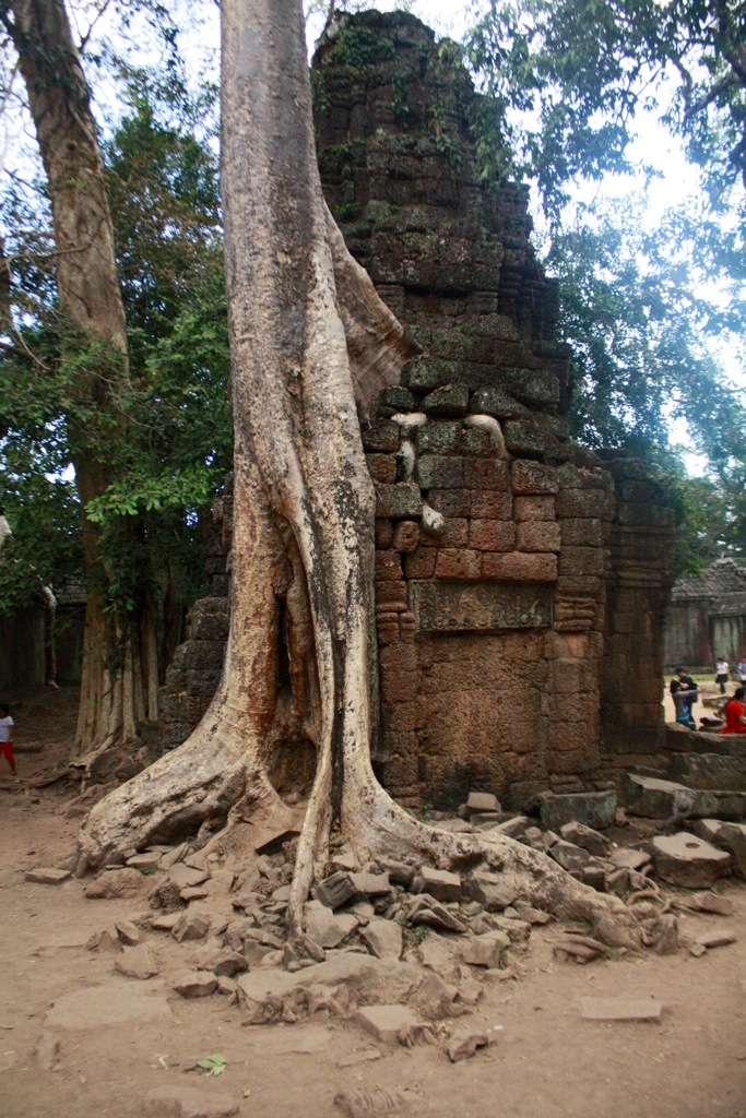 Next was Ta Phrom–the divine temple laden with Mother Nature’s giants. This is the temple that called me to Siem Reap. At Ta Phrom, massive trees with thick gnarled roots sprawl out and make themselves at home in the rooms created by the ruins. Birds who fly overhead and drop seeds into the crevices are responsible for planting these weight bearing wonders. Mel told me that the trees growing within the ruins are inherently and immovably buttressing their design. They are fatally intertwined. If a tree should get struck by lightning or die, the entire surrounding ruins would crumble. The scene we stood before was only temporary.