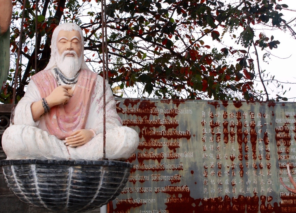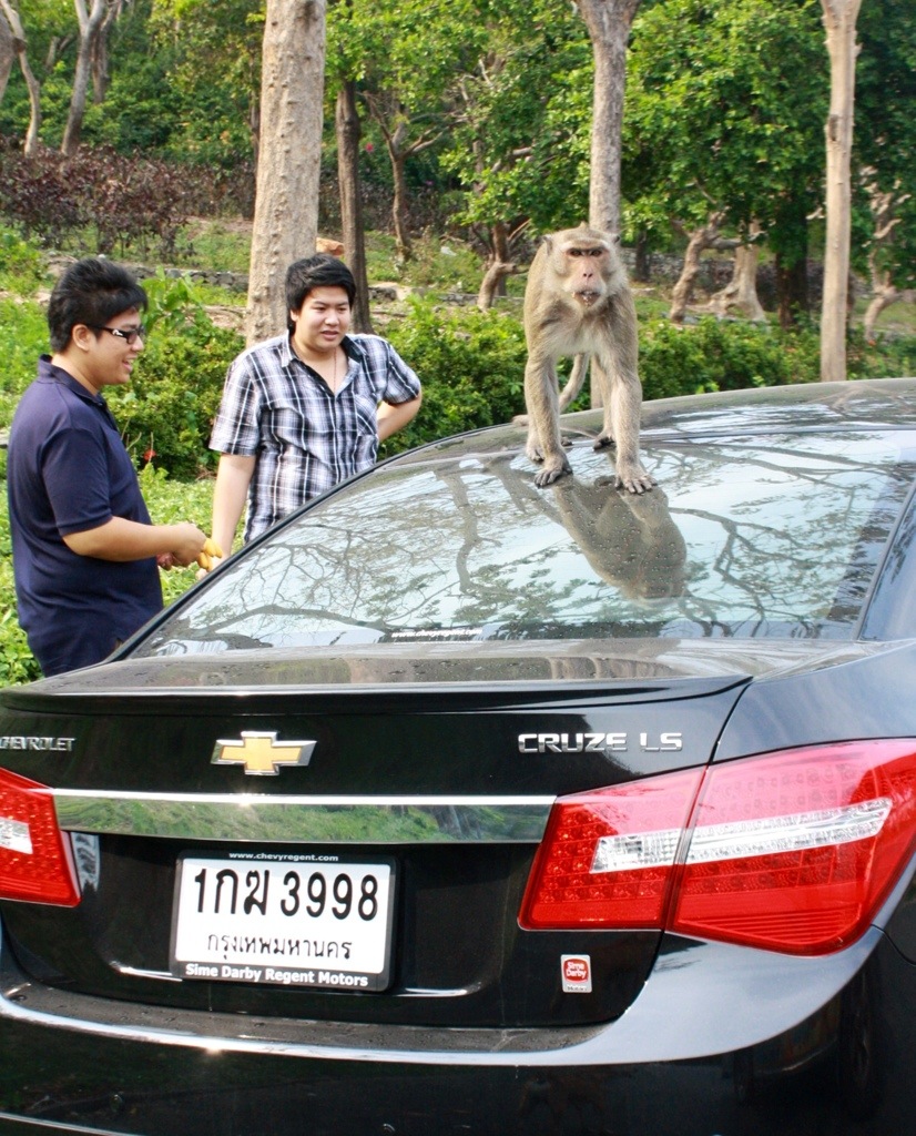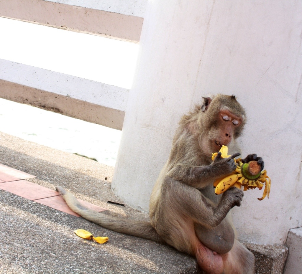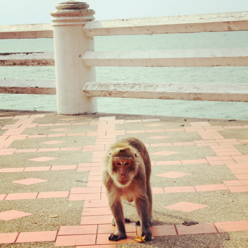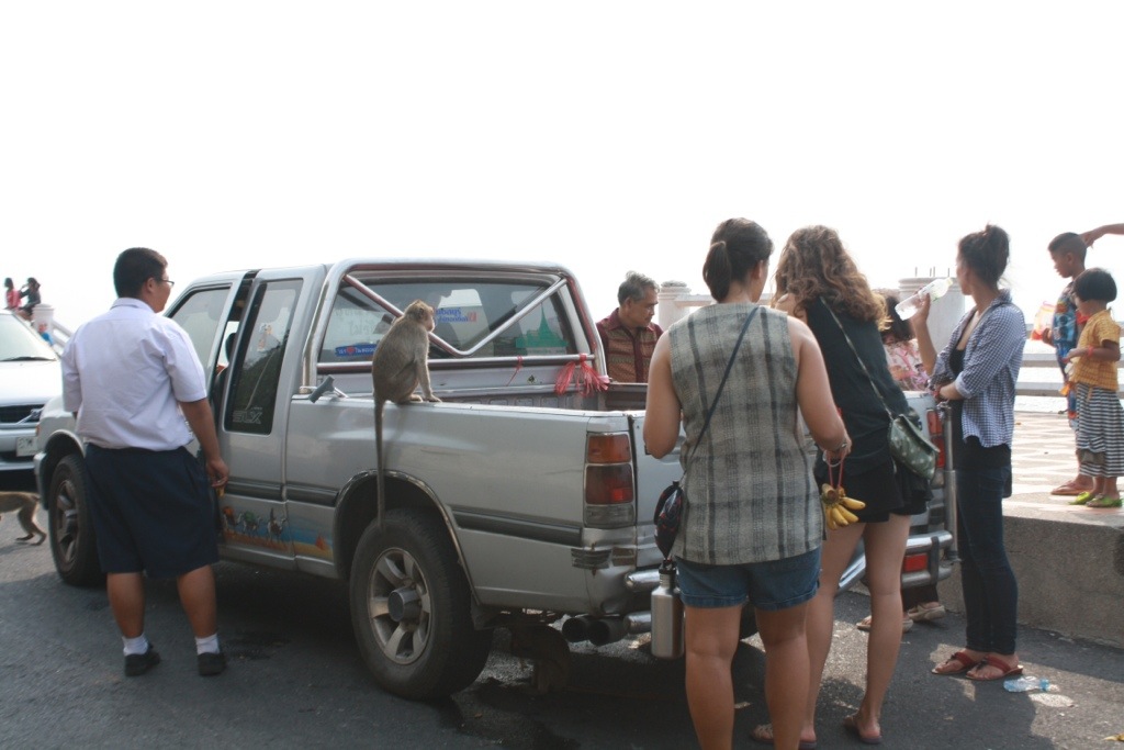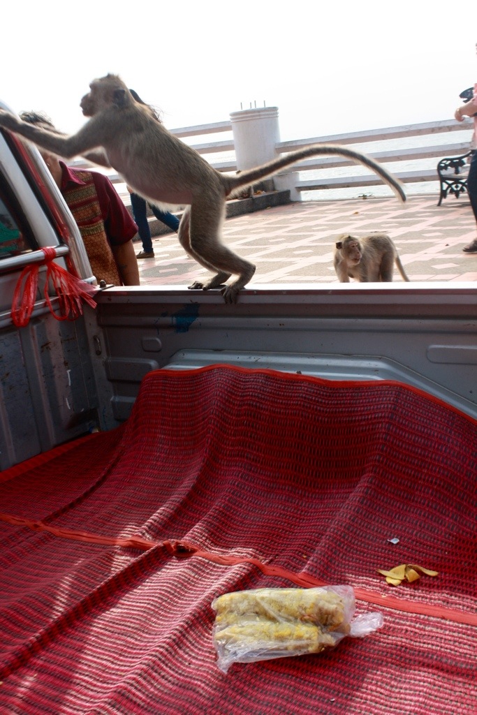 When your landlord asks to take you to lunch on a Sunday afternoon, you expect a laid back time at a local restaurant. Maybe even a picnic on the beach. But, this is Thailand, so instead I spent the day in the back of a truck ascending a mountain overrun by monkeys and descending into the agony of Buddhist hell. Khao Sammuk, or Monkey Mountain, was our first venture. Our landlady, Khunjai bought us a bag full of corn, which the monkeys stole right out of our truck bed, and a bushel of bananas which we fed to the little thieves anyway.