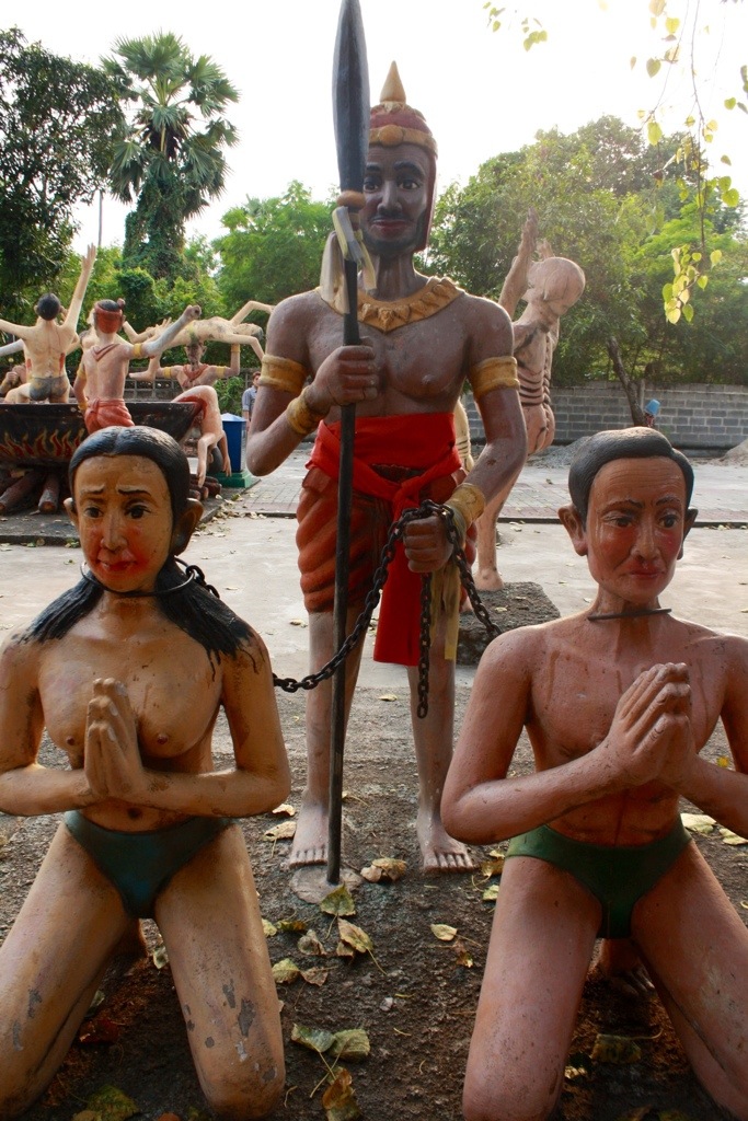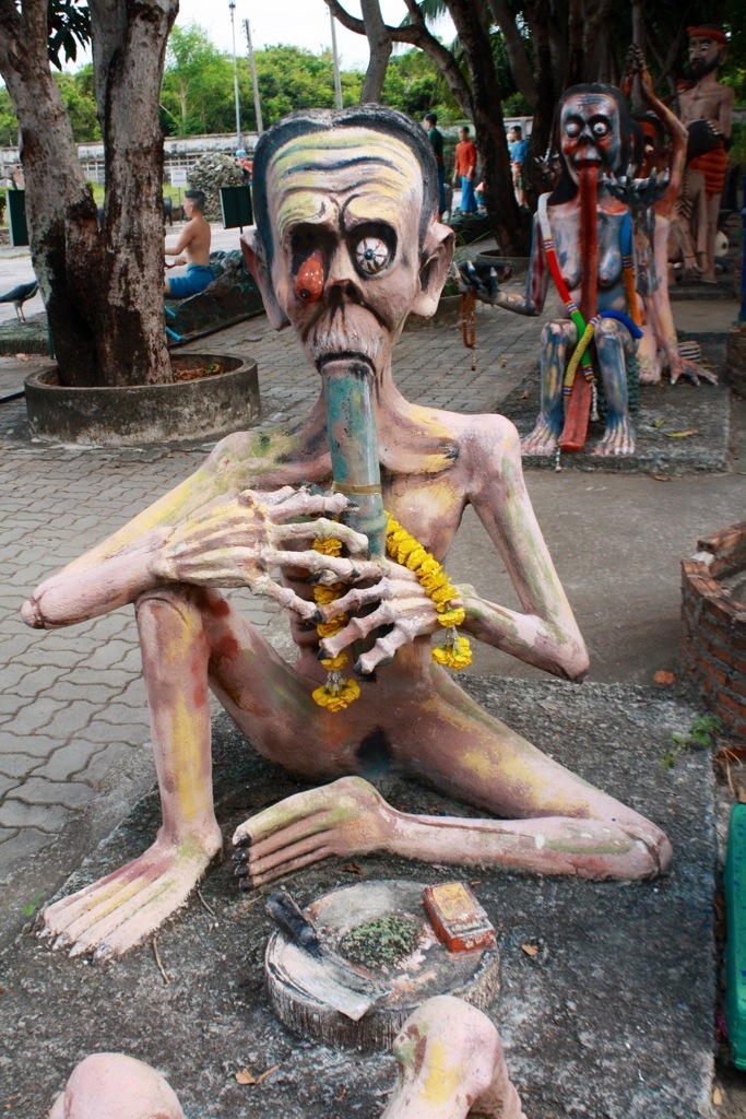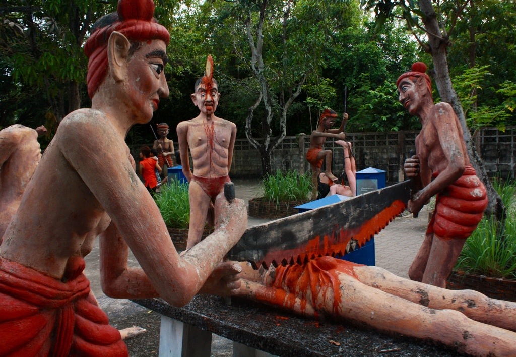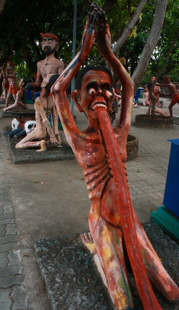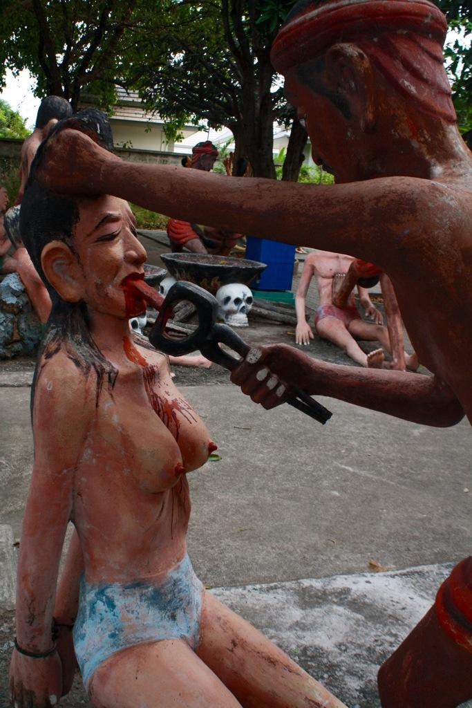 The Hell Garden of Wat Wang Saen Suk is a wonderfully macabre place where Dante’s Inferno meets Bosch’s Garden of Earthly Delights. The temple is replete with statues depicting the torture inflicted on those who go to Buddhist hell–each gruesome punishment in the underworld is befitting of the vice committed on earth. A vision of divine revenge and poetic justice actualized, similar to the contrapasso depicted in Dante’s Inferno. In virtually every direction you look, there is another lost soul being tormented in the most fascinating and unfathomably horrific way. There is no break for intermission between these endless scenes of desperation and ruthless barbarity. Bulging eyes, protruding ribs, dejected, disfigured faces. Castrated genitals, gushing entrails, impaled figures hopelessly begging for mercy. Wang Saen Suk was dark and disturbing, and I loved every inch of it.