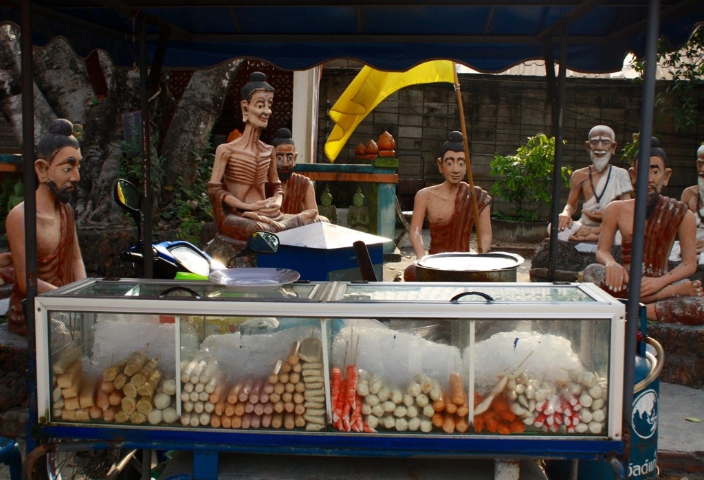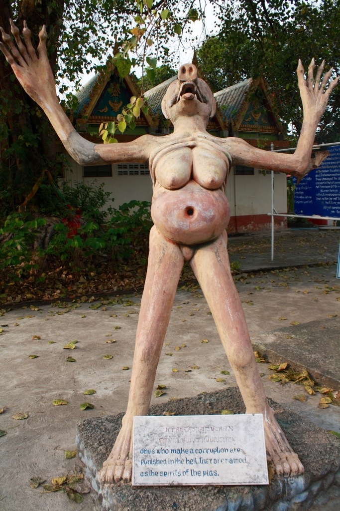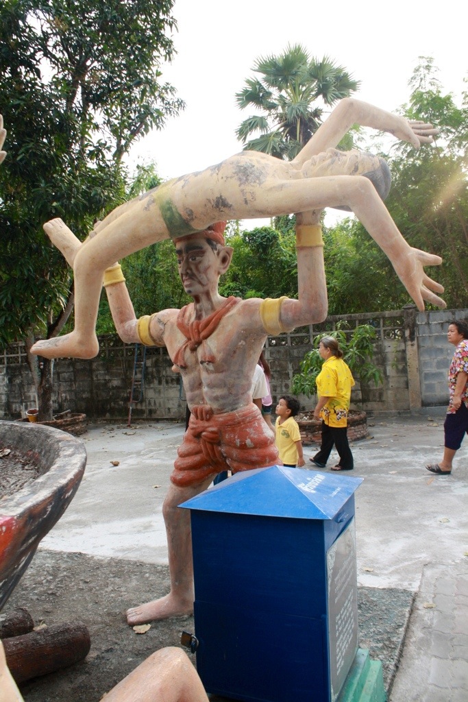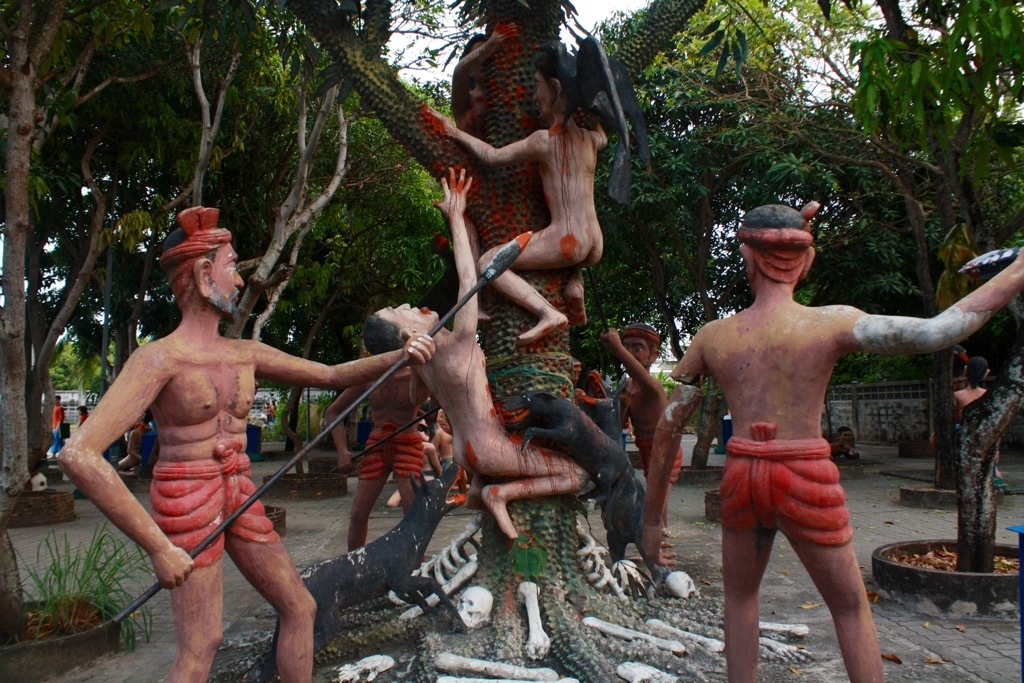 The Hell Garden of Wat Wang Saen Suk is a wonderfully macabre place where Dante’s Inferno meets Bosch’s Garden of Earthly Delights. The temple is replete with statues depicting the torture inflicted on those who go to Buddhist hell–each gruesome punishment in the underworld is befitting of the vice committed on earth. A vision of divine revenge and poetic justice actualized, similar to the contrapasso depicted in Dante’s Inferno. In virtually every direction you look, there is another lost soul being tormented in the most fascinating and unfathomably horrific way. There is no break for intermission between these endless scenes of desperation and ruthless barbarity. Bulging eyes, protruding ribs, dejected, disfigured faces. Castrated genitals, gushing entrails, impaled figures hopelessly begging for mercy. Wang Saen Suk was dark and disturbing, and I loved every inch of it.