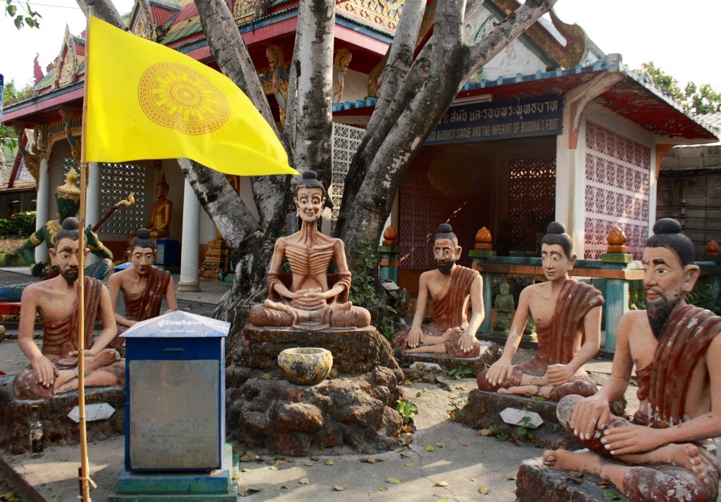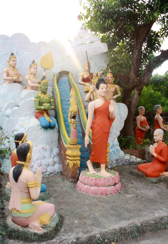 In the front of the temple, tranquil scenes and statues representing the Buddha.