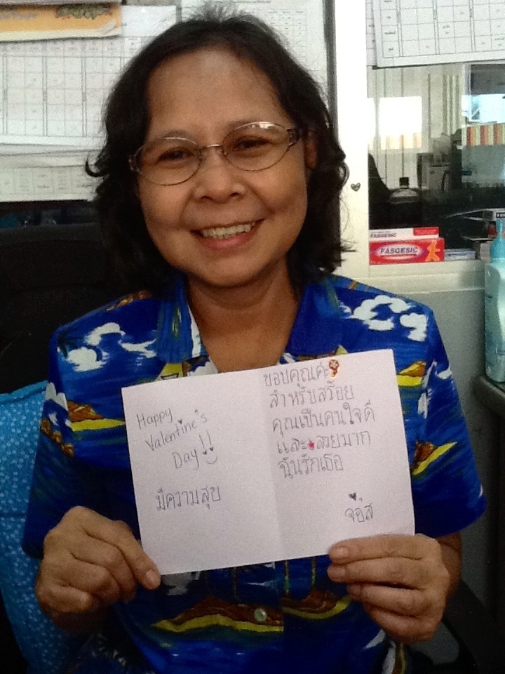 Ja with a card I wrote in Thai for her on Valentine’s Day.