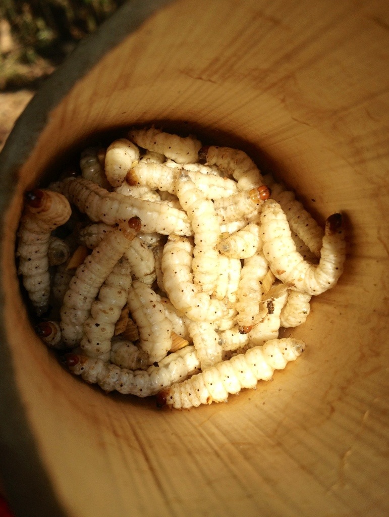Momma Suwannee identified the hiding spot of these caterpillars immediately after spotting the chewed holes in some bamboo stalks nearby. She promptly chopped down the bamboo and fried up the larvae for dinner.