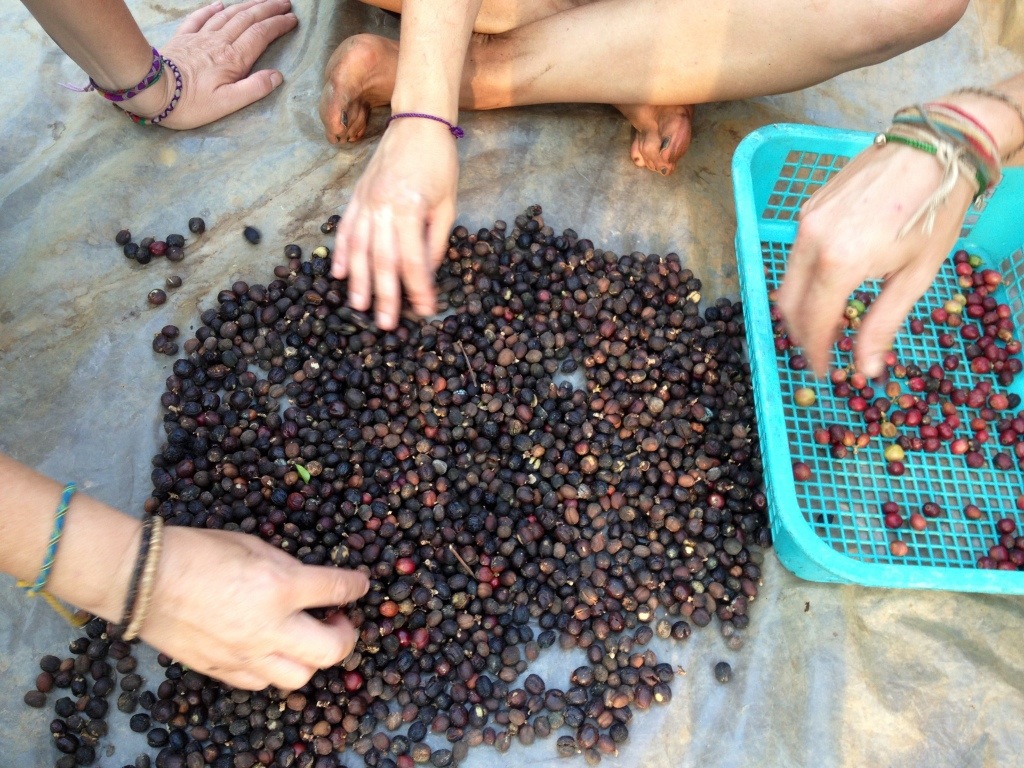Sue, Lilith, and Teacher Boy sorting coffee beans.
