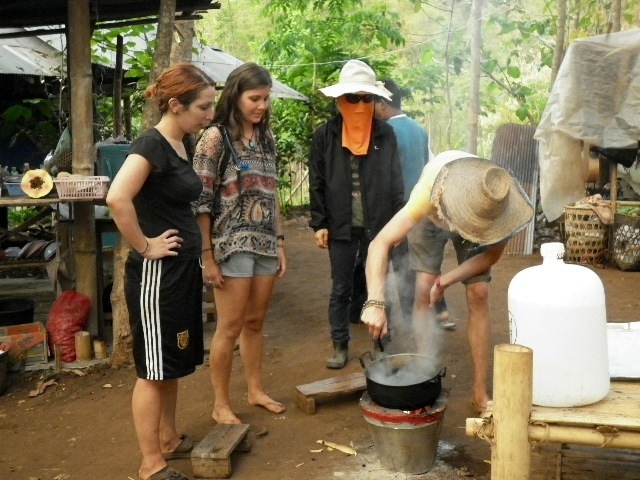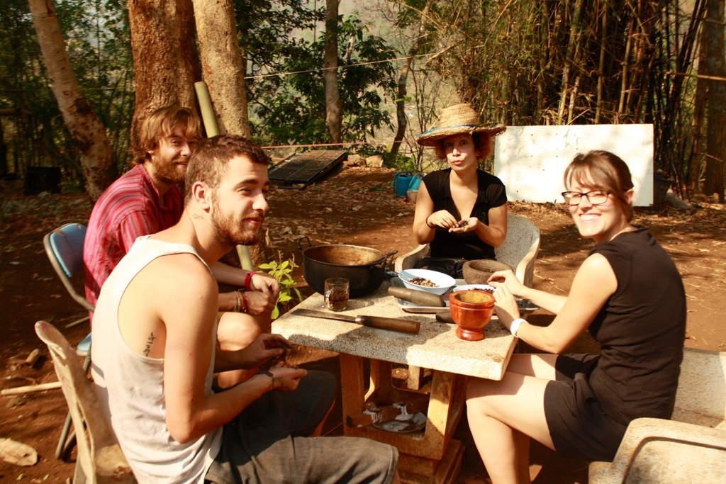 Sometimes Mr. Sao took us on adventures through rice fields and to waterfalls, teaching us about the medicinal properties and practical purposes of the plants we encountered along the way. We learned just some of the infinite uses of bamboo. Sao and Suwannee use this wondrous plant to make houses, chairs, fires, shovels, drinking cups, lunch and dinner, showers, cell phone towers, and didgeridoos. We spent many afternoons picking coffee beans from the coffea trees nearby on Sao’s land. After 5 or 6 of us filled our bags, we went back to home base to begin the meticulous and time-consuming, yet satisfying process of preparing our own coffee. First, we sorted the beans, keeping the brown beans and setting the red and green beans aside until they became ripe. We then roasted the brown beans, shelled them, and roasted them again on an open fire. We took turns grinding the beans with a mortar and pestle, the very last step. Every morning we enjoyed steeping the grounds and sipping a rich cup of coffee, the reward for all our hard work. On other afternoons, we would help Sao and Suwannee by chopping veggies, folding sticky rice in banana leaves (Khao Lam), or foraging for fruits and fungi. We always ate like kings. Our meals were copious and regularly included stewed feasts of mango, papaya, bamboo, cabbage, morning glory, curries, jack fruit, mushrooms, and, of course, rice.