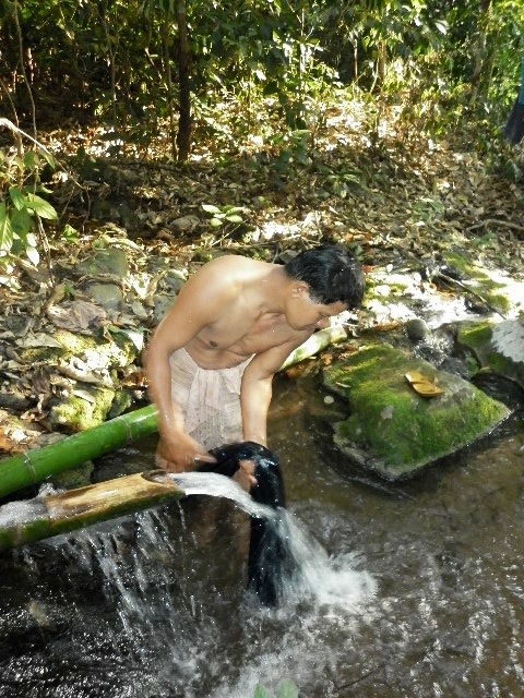 Sao washing up in the stream with his homemade bamboo shower.