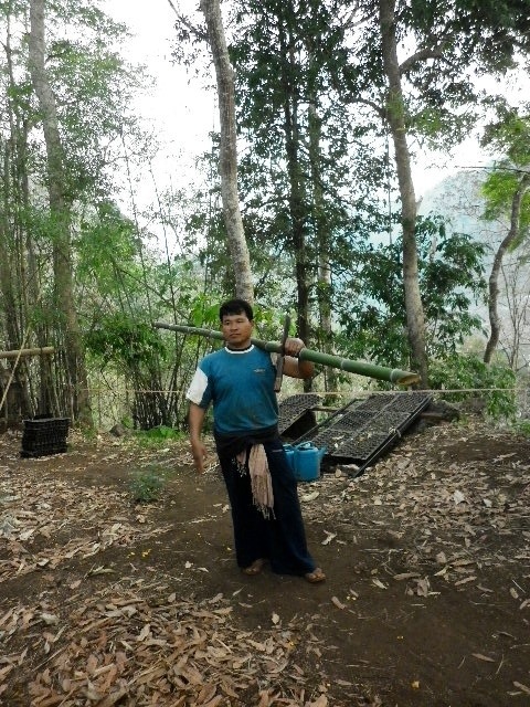 We would take breaks often, in fact “take a break” was one of Sao’s favorite phrases. The instant he saw me wiping my brow of sweat or taking a second to rest, he would joyously exclaim, “Take a break, take a break! Teacha Jos, drink coffee, drink tea, drink coffee, drink tea!” And so “breaktime” occurred regularly, beginning around 11 am and usually lasting until hours after our noontime lunch. After lunch, we would read, write, enjoy life. At 3 pm, we would resume work or other various activities. Sometimes we would run errands around the village with Mr. Sao, meeting his friends and familiarizing ourselves with village life. We watched his sister make fabric from a homemade loom, picked up a bottle of local honey from his friend who owned a beehive, picked and ate fresh tamarinds and mulberries.