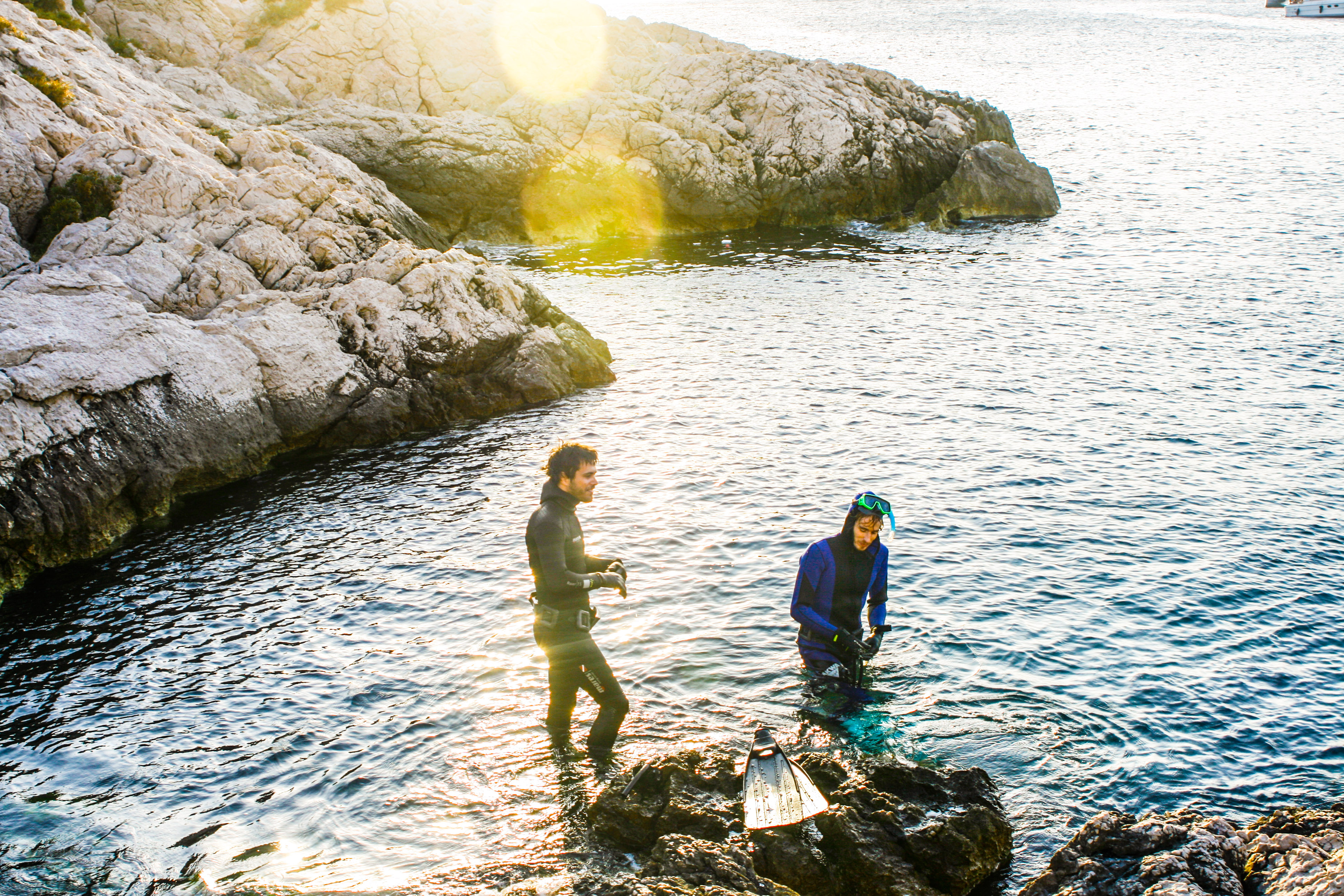 Marseille is a hilly city and walking to the coast is a trek, but my legs welcome the burn. We are to meet another friend, Antoine, at Anse de Malmousque–a cove that grants easy access to the sea. Antoine is already there waiting for us and greets us with an enthusiastic, waving arm. With the last few minutes of daylight, we slip into the cold, choppy water with glee. It’s my first time in the Mediterranean, and the salty taste on my lips and the weightless feeling of my body surprises me.