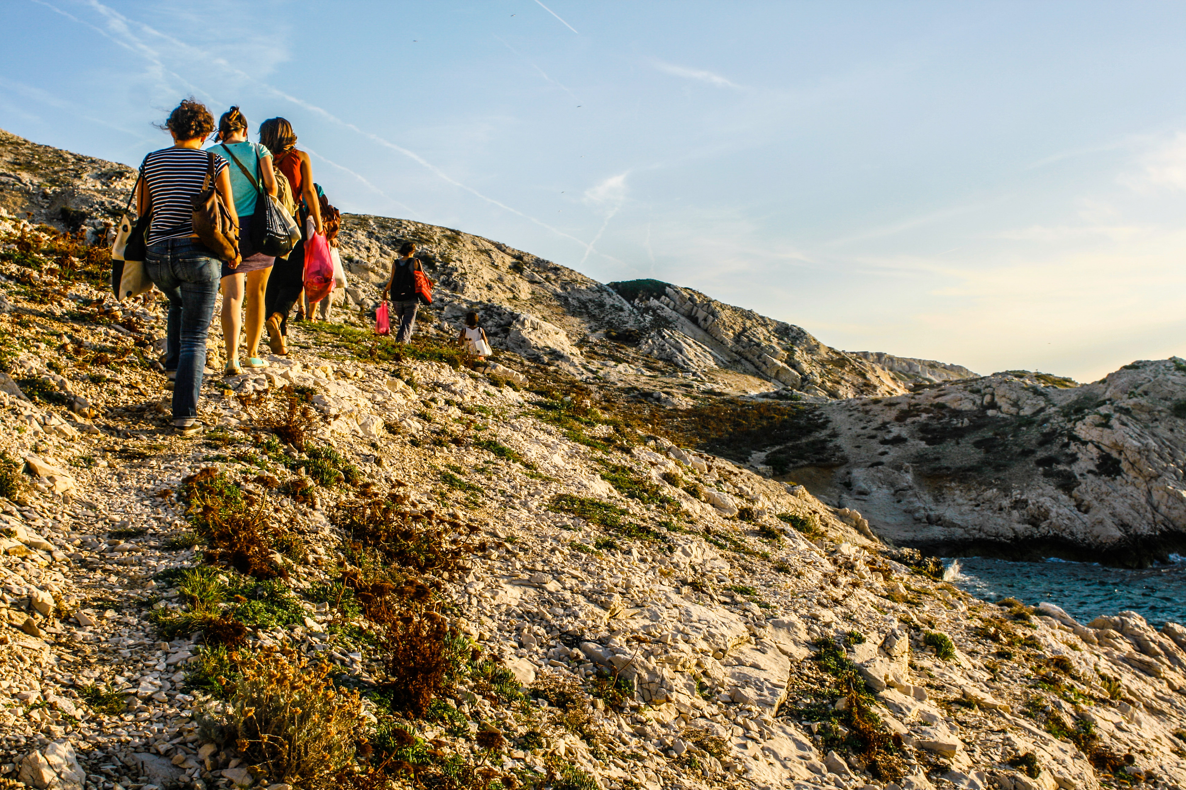 When Nolwenn gets off work, she invites me to a girls-only picnic she is having with her friends on Île Frioul, a tiny, largely uninhabited island and a 30-minute ferry ride from Marseille. Waiting for the boat, six of her friends arrive, each with bags on their arms. They are all beautiful and sun-kissed, gregarious and laughing innocently and often. I understood very little at the picnic, but I was happy to be in good company. When we found the perfect spot among the cliffs, they spilled their bags out with their gifts of sustenance: Cheeses, breads, hummus, olives, spreads, jams, fish, Belgian beer, and three colors of wine. I am never wanting, never without in Marseille.