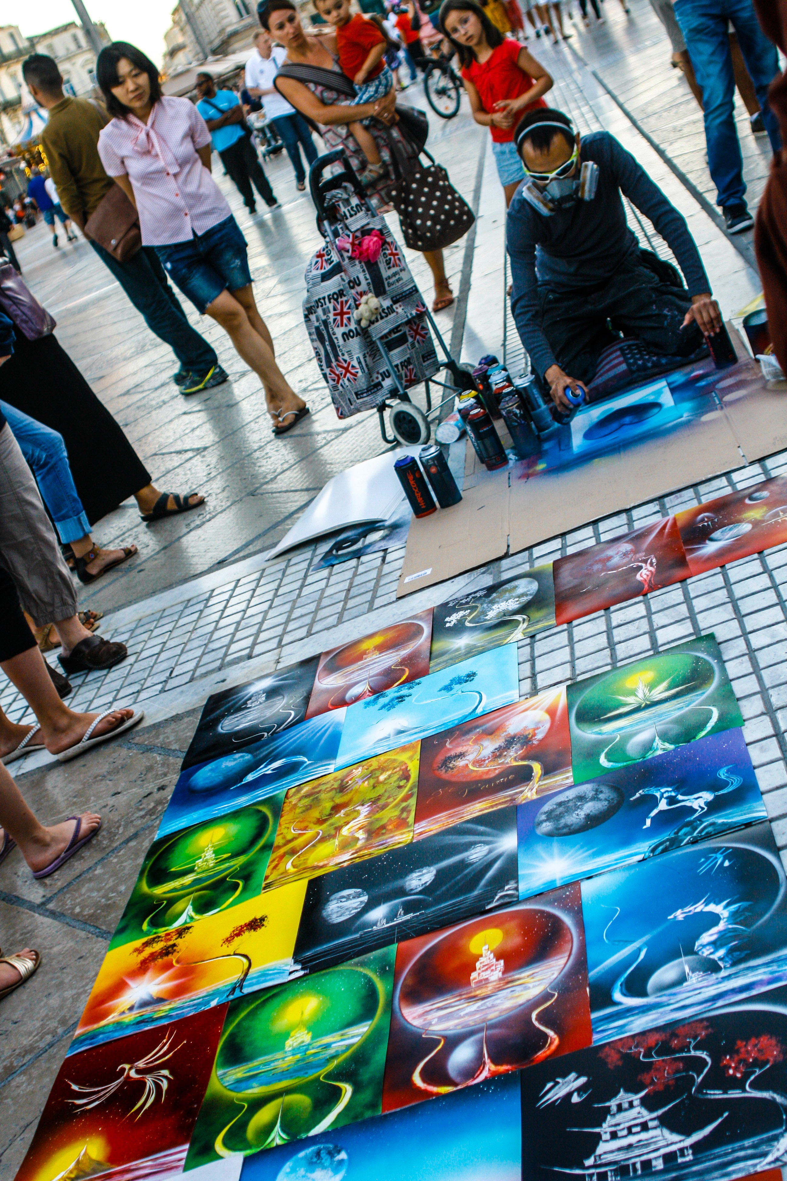 Spray paint artist in Montpellier kneeling on an American flag pillow.