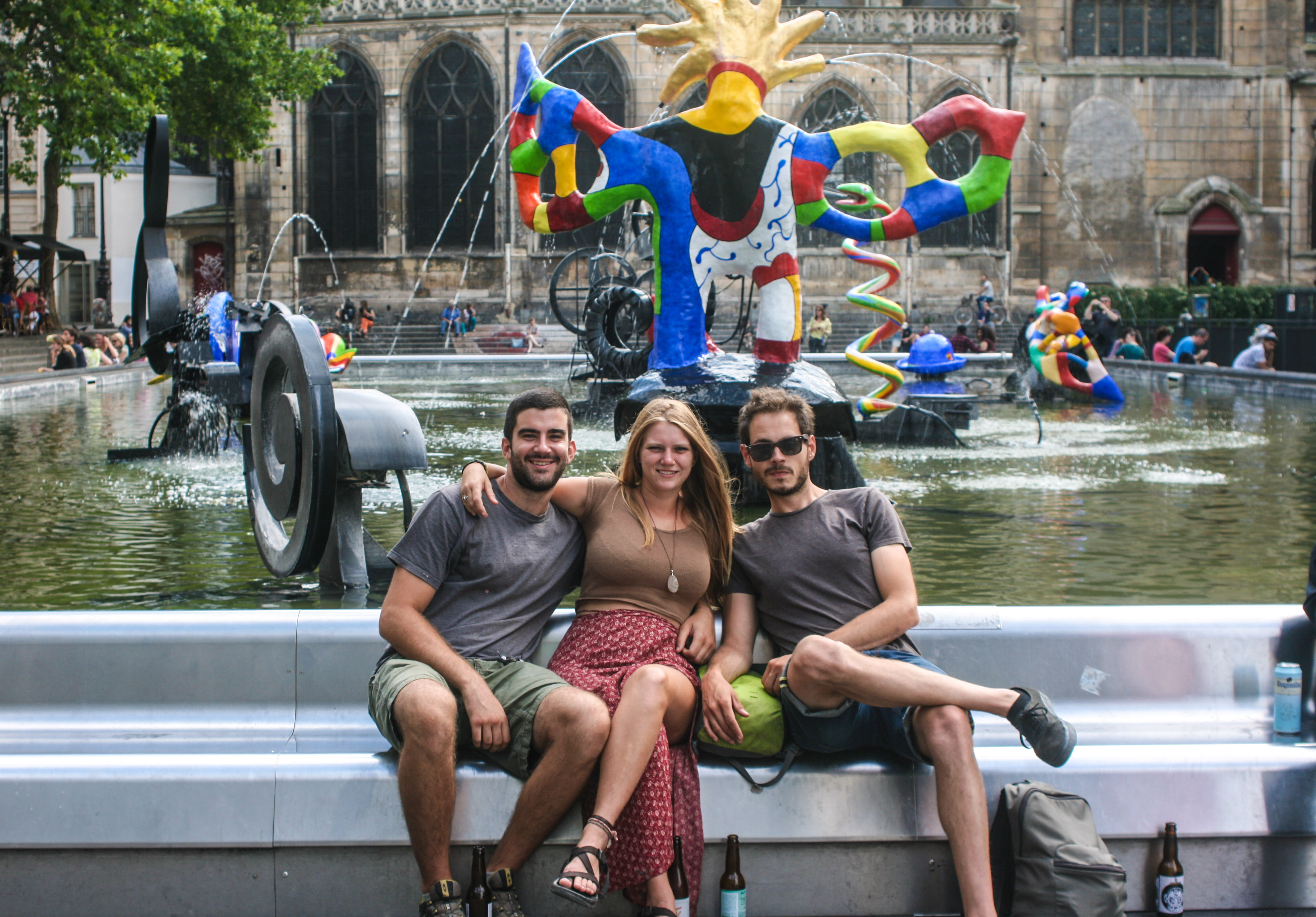 Colin, Lauren, and John-Scott in front of La Fontaine Stravinsky, outside the Centre Pompidou.