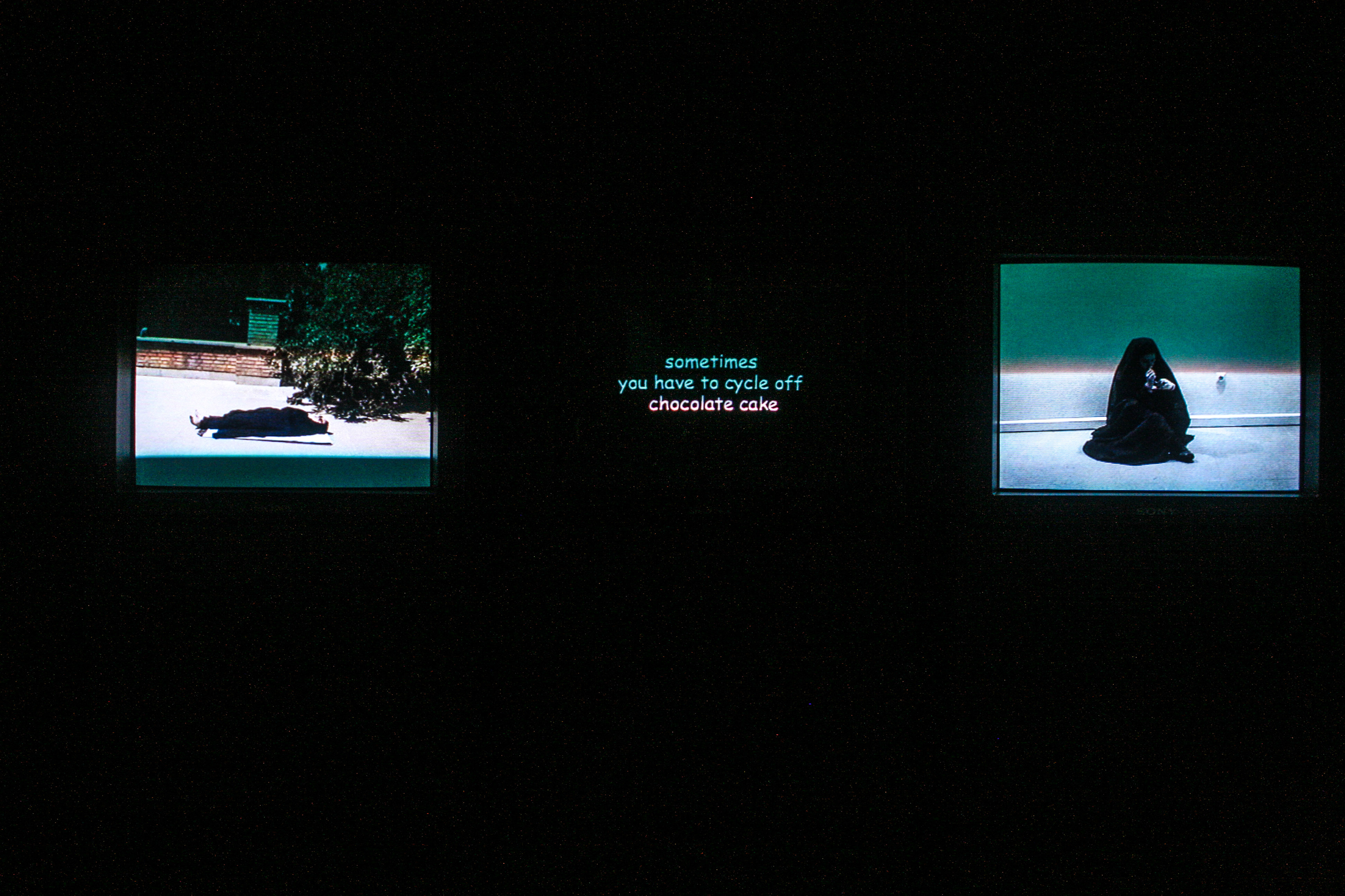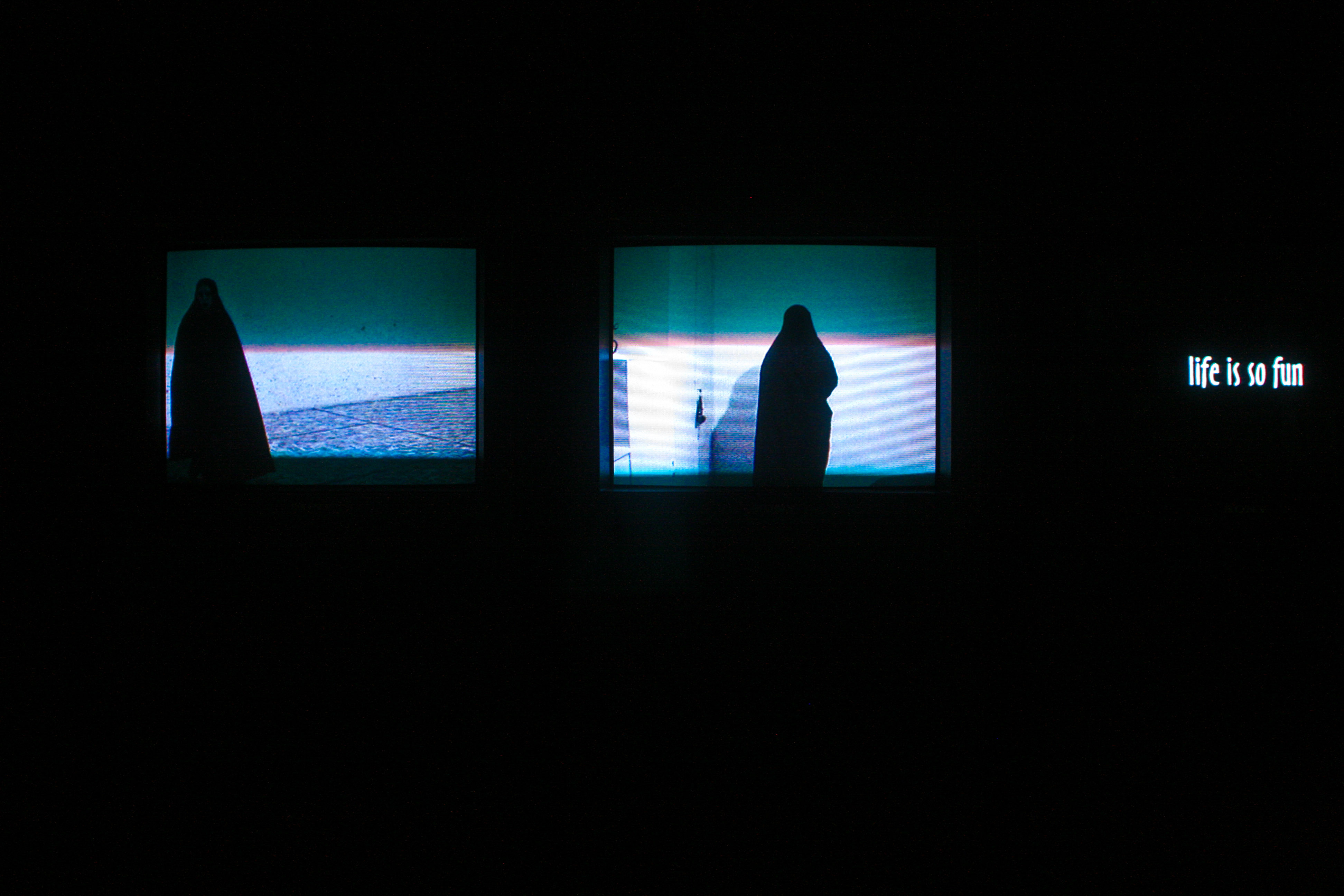 “In Me 1997-2000, the Iranian visual artist and performer Ghazel created a series of quirky self-portraits consisting of short filmed sequences intersperses with texts. With great economy of means, she filmed herself wearing a chador in areas of modern life and everyday situations, where the wearing of this garment sometimes creates absurdity. Mockingly evoking women’s condition in Iran, she also questions—with apparent light-heartedness—her own difficulty in moving between East and West, remaining somewhat ‘suspended between two worlds.’ “