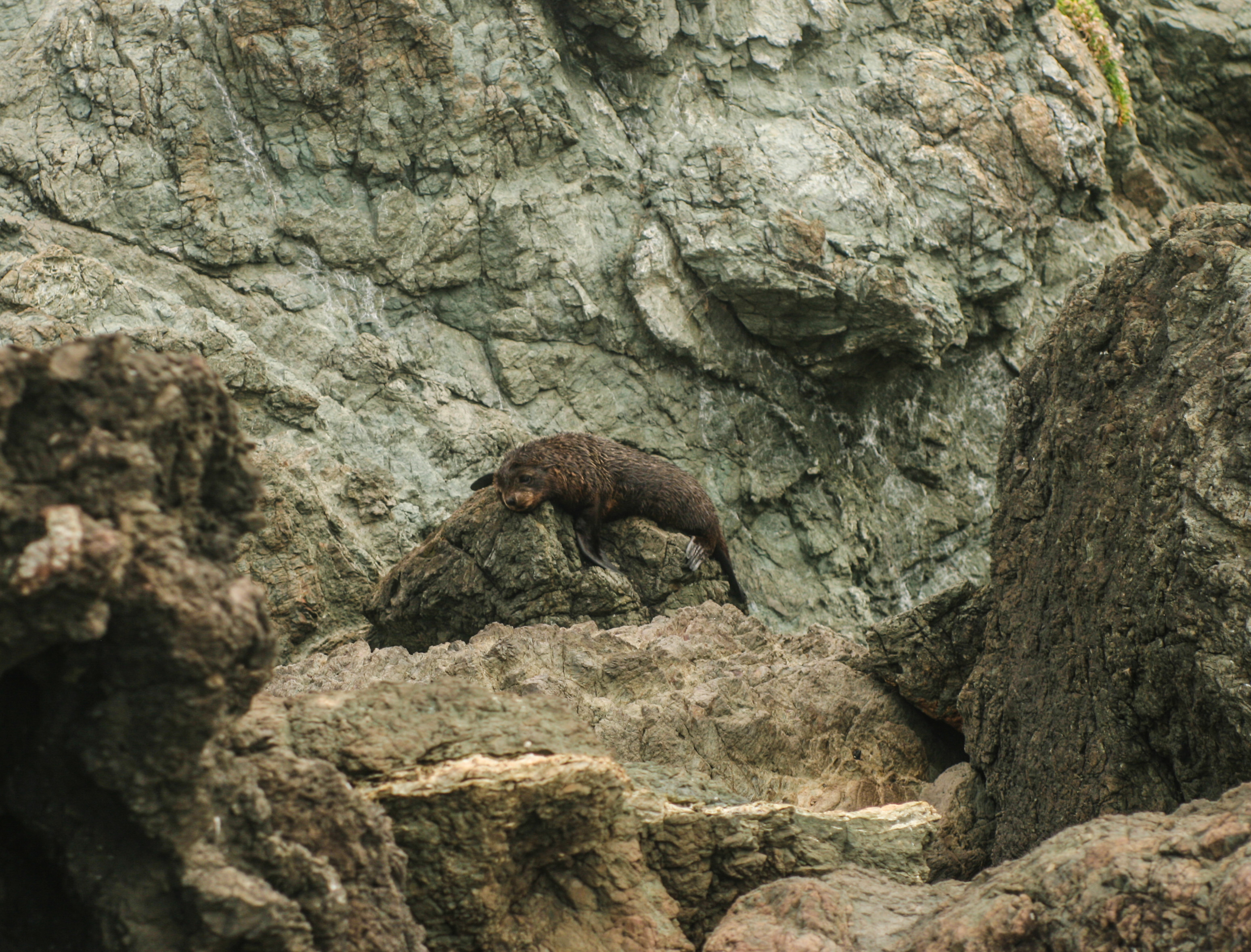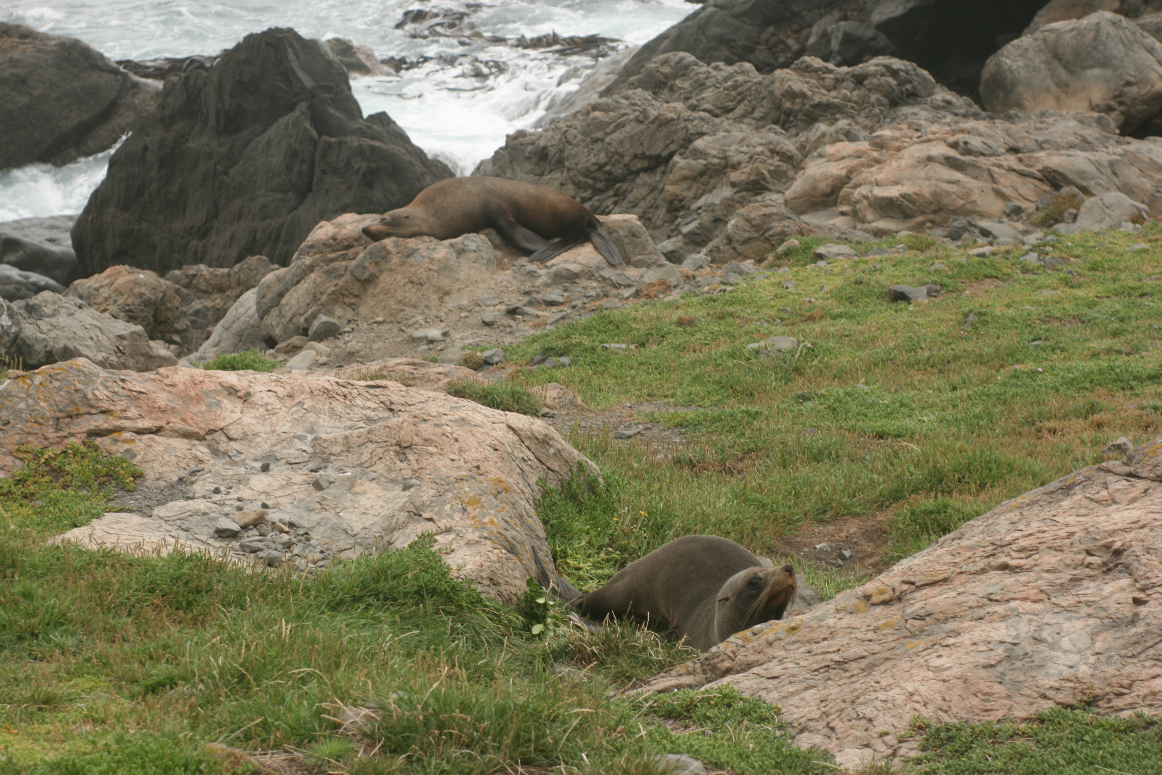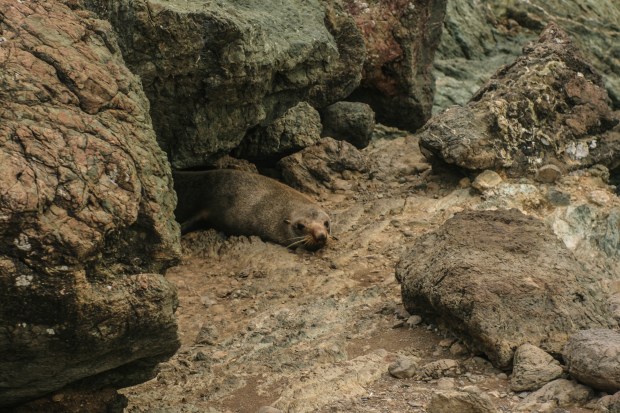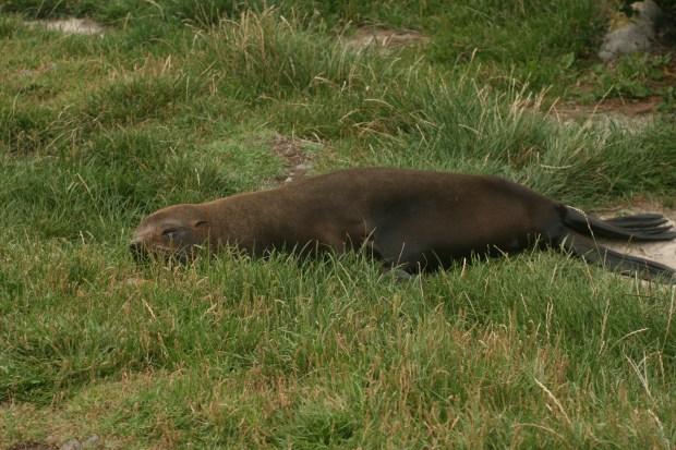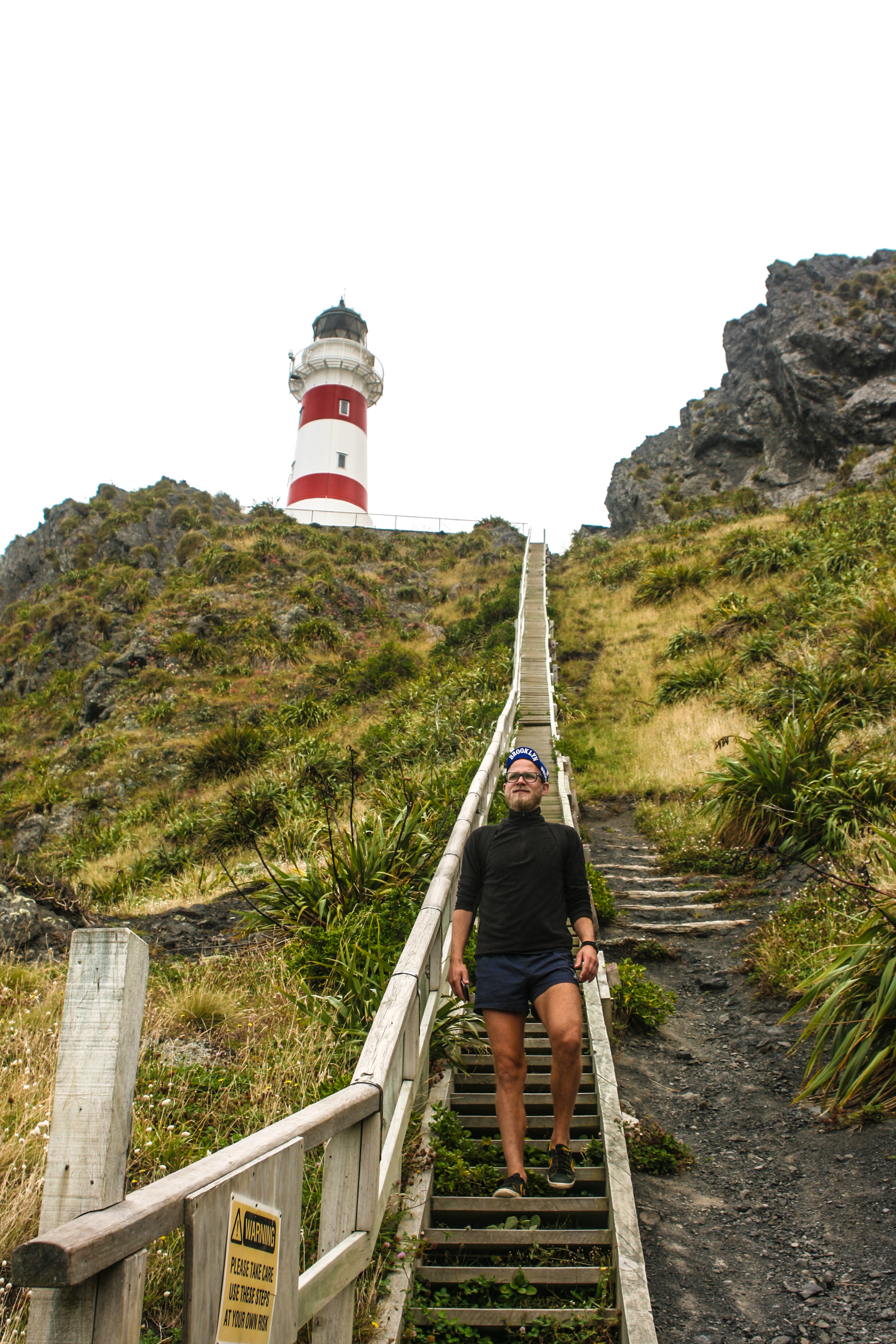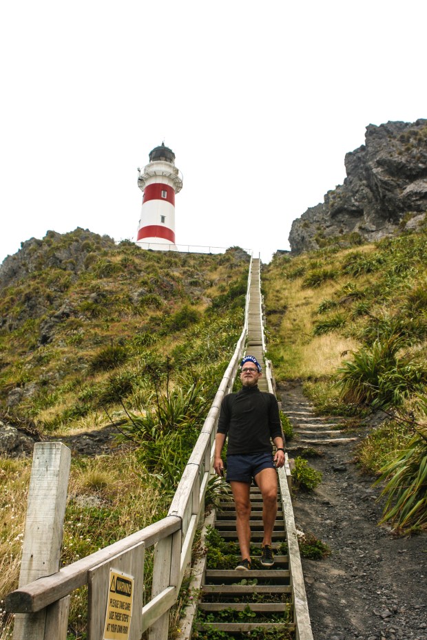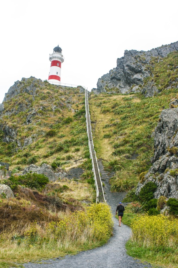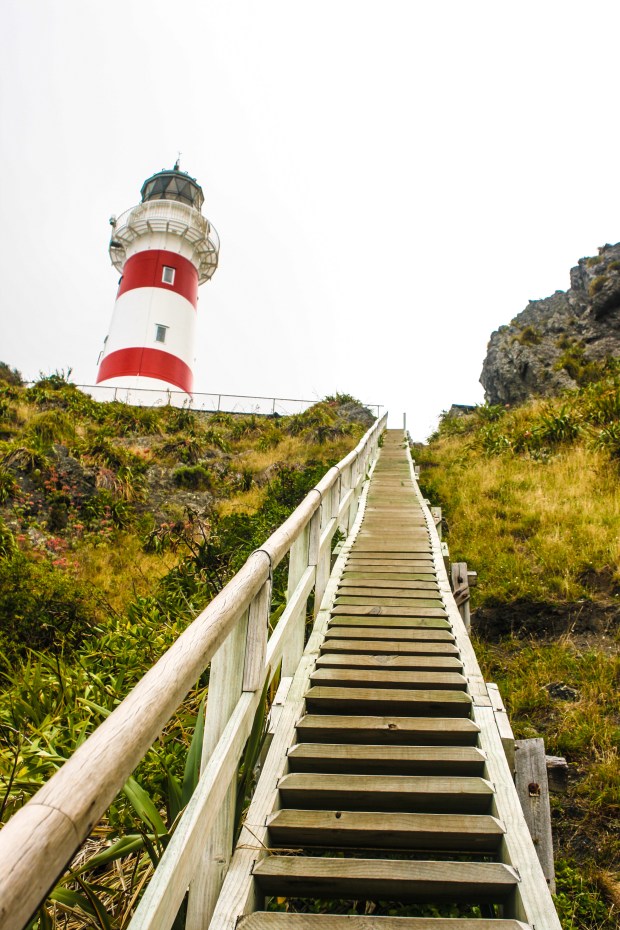 A red and white striped lighthouse perched atop a craggy clifftop became visible after we rounded a turn. It beckoned us further, toward it and a swirling gray and gloomy sky. The 251 narrow, wooden steps that led to the lighthouse’s perch looked like a giant zipper on a grassy coat which kept the hill warm from the chilly gusts of wind that whipped in from the open ocean. There was only one way up and only room for one person on each step, which taught people at the top and bottom of the staircase to be patient. At the top a couple told us about a seal colony, the largest in New Zealand, that lives amongst the rocks just a few minutes down the gravelly road we just came from.